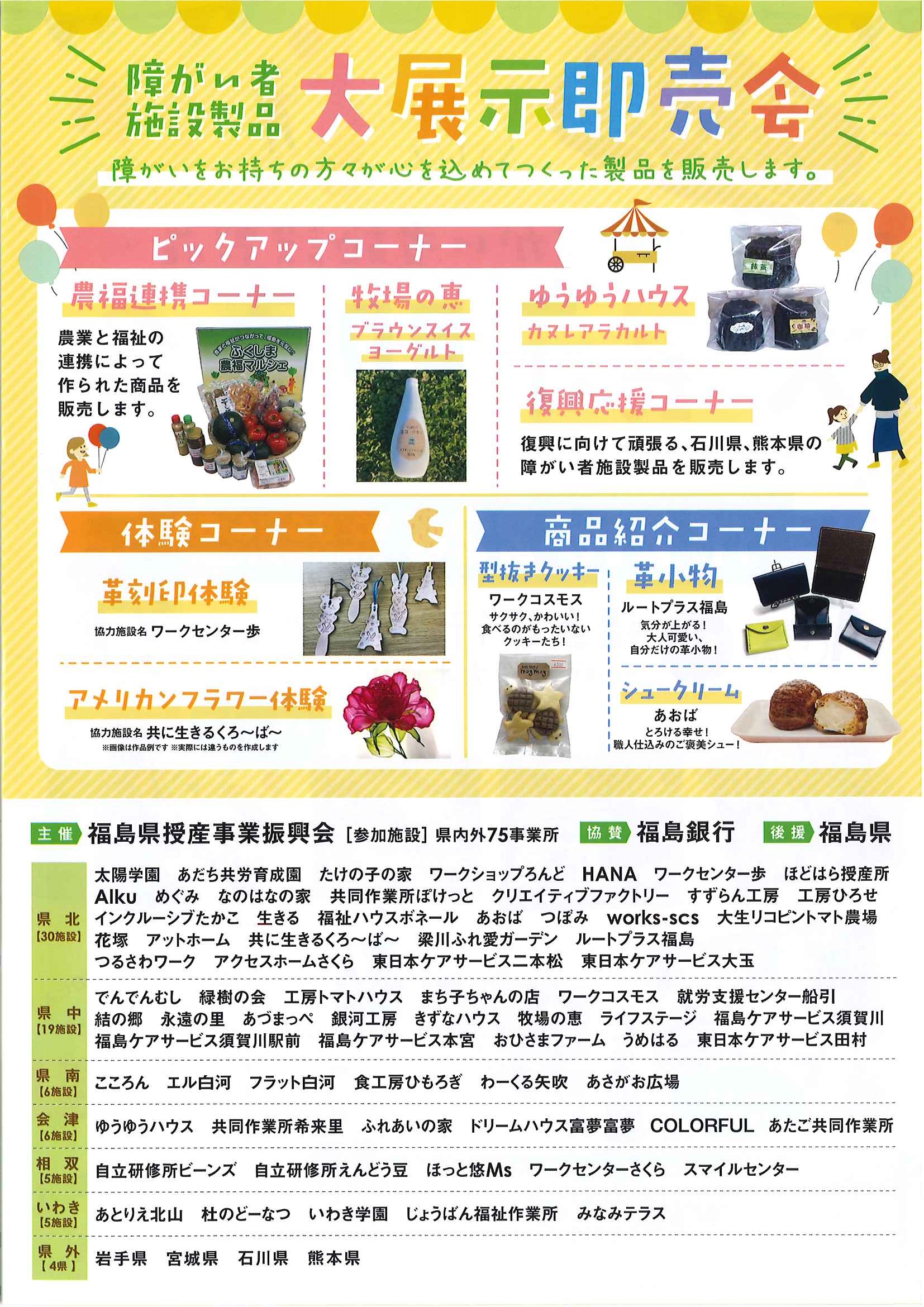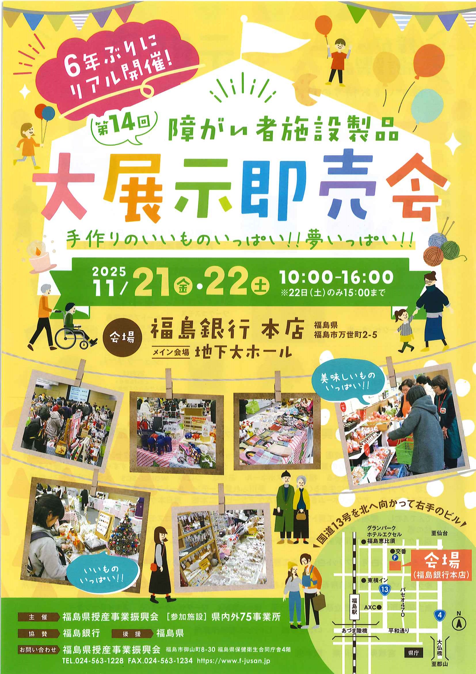〇 第14回障がい者施設製品大展示即売会 開催月日:令和7年11月21日(金)から11月22日(土) 開催時間:10:00~16:00 ※22日は15:00まで 開催場所:福島銀行本店 福島県福島市万世町2番5号 その他 :駐車場は混雑が予想されます。 公共交通機関等のご利用をお願いいたします。