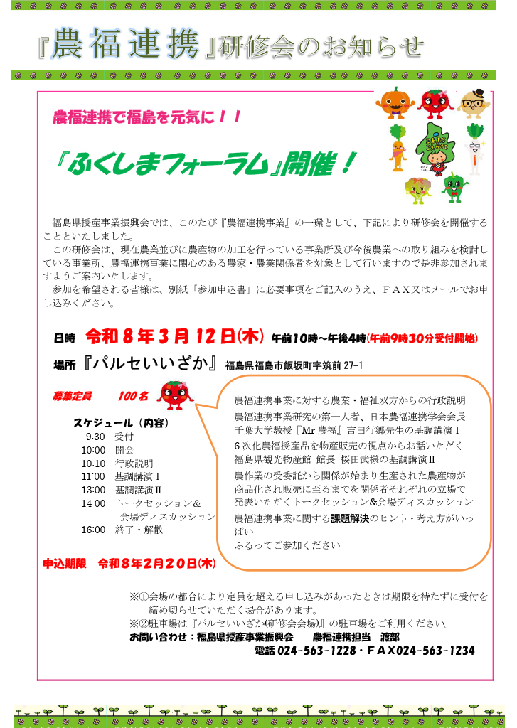 農福連携のさらなる推進を目的として、農福連携研修会「福島フォーラム」を開催いたします。